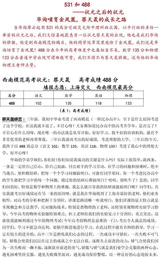 西南模范高考狀元:蔡天晟高考成績(jī)488分上海交大