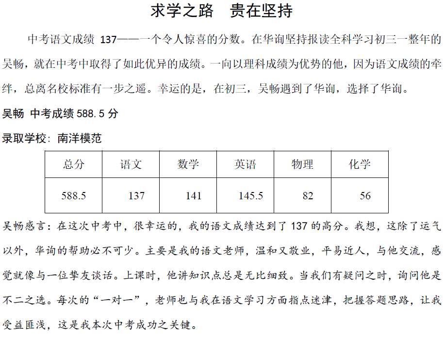 吳暢中考成績(jī)588.5分錄取學(xué)校: 南洋模范